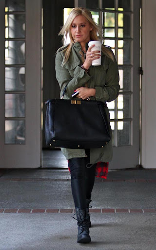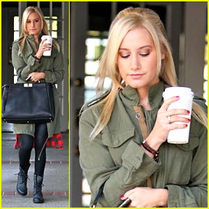 La chica de “High School Musical” parecía super-profesional, que llevaba su taza de café pasado, luciendo un vestido verde del ejército con pantalones negro y botas de color negro.